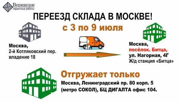 Уважаемые партнеры! Обратите внимание! С 3 по 9 июля 2023 г. наш склад товаров для укладки паркета с адреса 2-й Котляковский пер., вл. 18 будет переезжать на новый адрес - пос. Битца, ул. Нагорная, 4Г. Новый склад находится в 1 км от МКАД (удобный заезд с МКАДА) и рядом со станцией МЦД «Битца» (5 минут пешком).