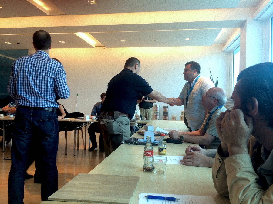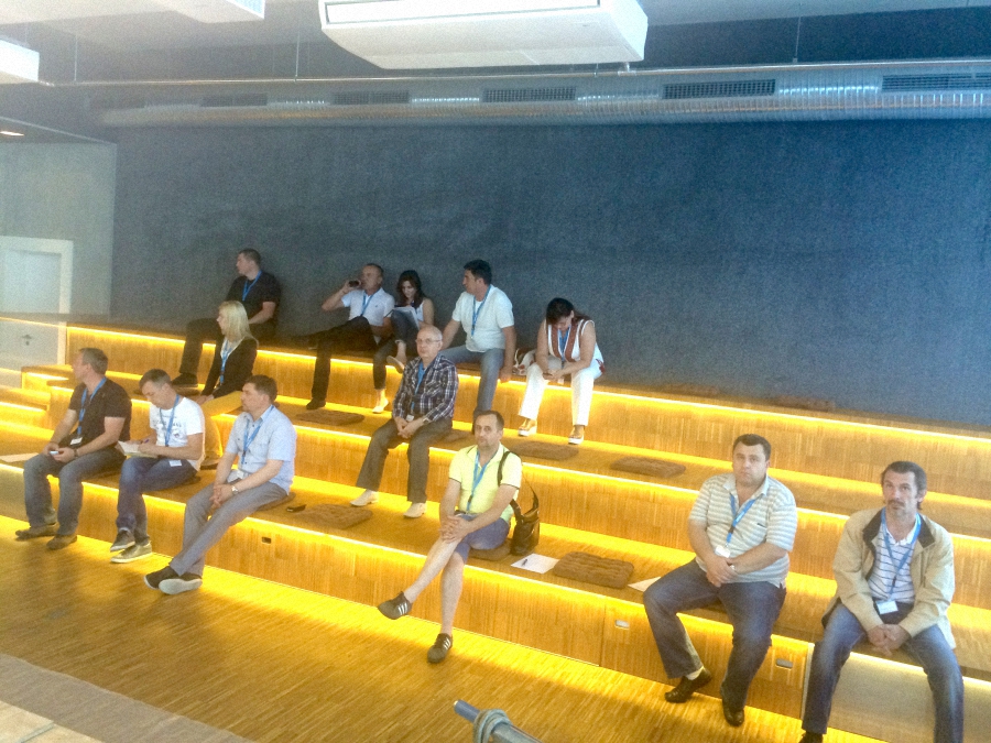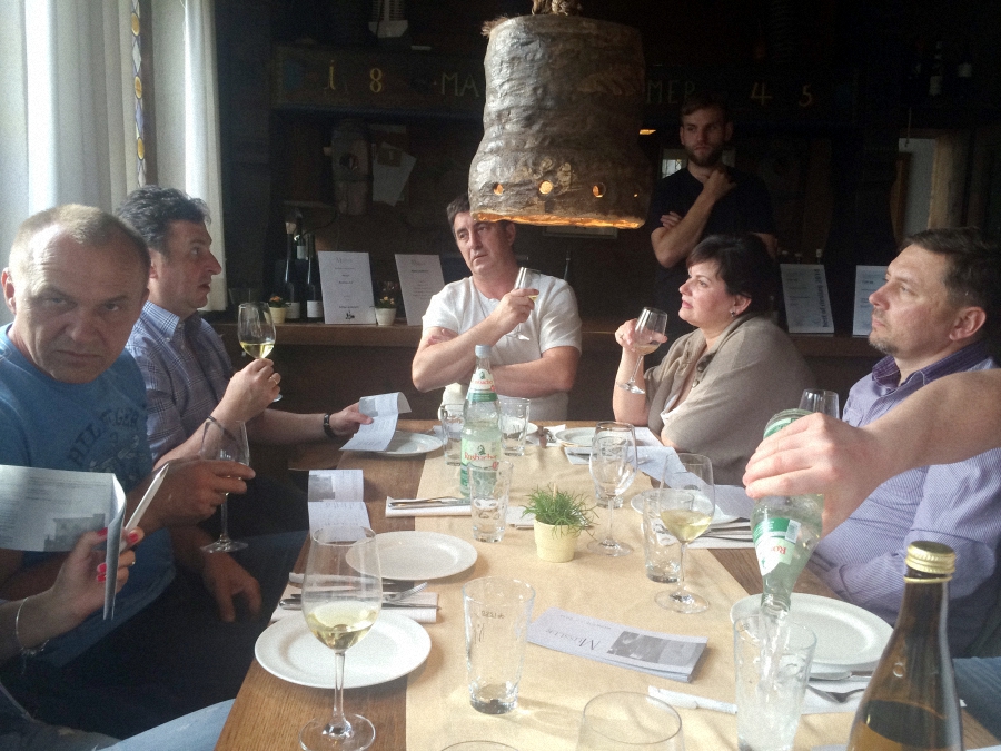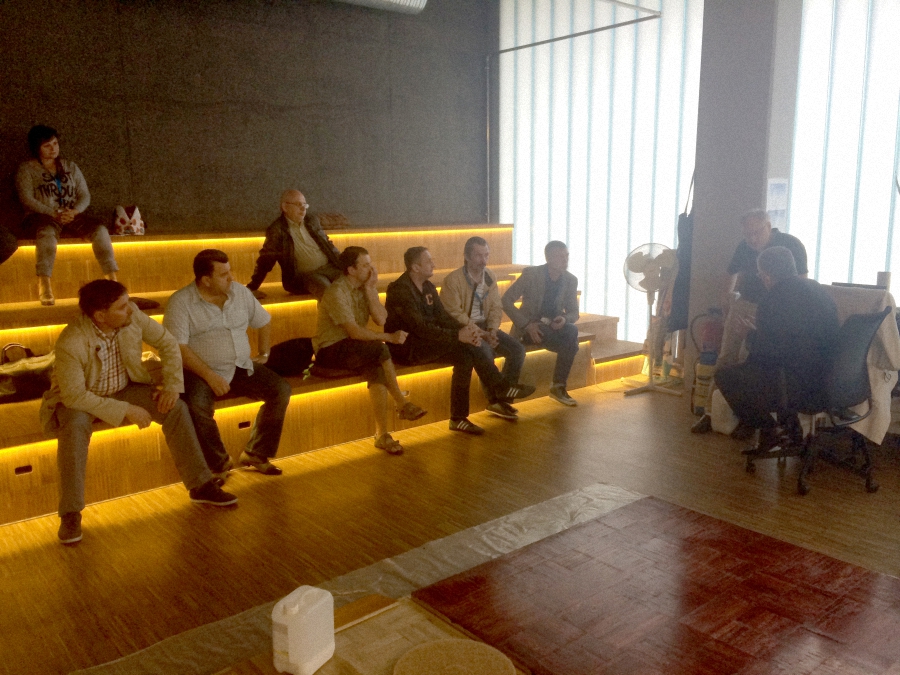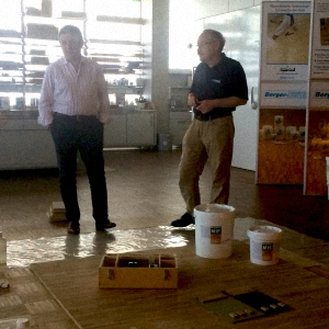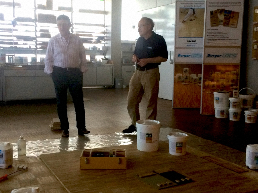 Первый рабочий день - ранний подъем и сбор на площадке производства Berger-Seidle. В самом начале владелец Berger-Seidle Томас Адам обратился с приветственной речью к участникам семинара. Специалисты из России и Украины собрались в шоу-руме предприятия, проявив неподдельный интерес к новым технологиям. О тонкостях применения тонированных масел собравшимся рассказал совладелец завода и управляющий директор по восточной Европе Гиви Джониевич Яшвили. Те, кто использует продукцию Berger, задавали практические вопросы по технике работ. По окончании первого дня семинара московские паркетчики встретились на винодельне за дегустацией вина и национальных немецких закусок и за неспешной беседой.