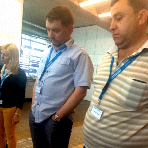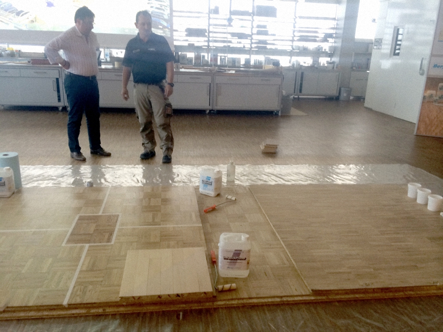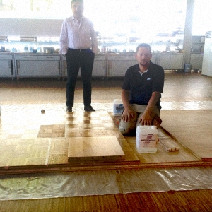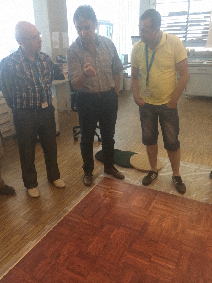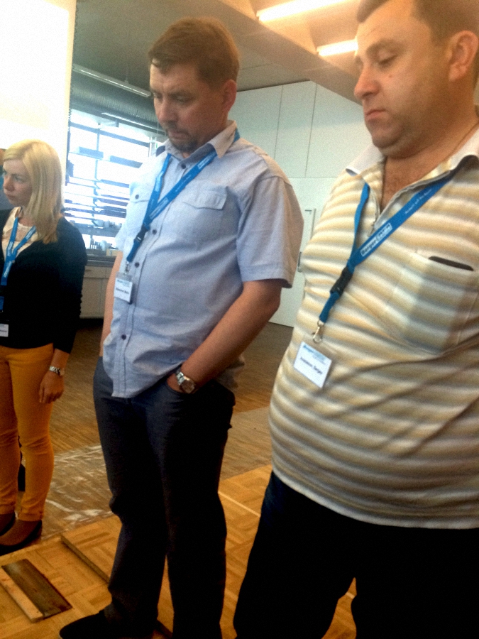 Второй день оказался таким же информационно насыщенным. В начале специалист компании Свен Айэ рассказал о различных свойствах грунтовочных лаков, вслед за ним выступил доктор Вольфган Кален и презентовал новый клей M1P, гибрид, совмещающий эластичность M1S с прочностью P1. Любое утверждение приобретает настоящую убедительность после демонстрации. Был проведен тест клеев на силу отрыва от загрунтованного и не загрунтованного оснований. Испытания показали, что современные клеи прочнее отдельных видов стяжек. Ральф Берегсаси - профессиональный паркетчик и член Европейской гильдии паркетчиков продемонстрировал технику применения цветных красок и алкидно-масляного лака для тонирования паркета. После семинара неформальное общение продолжилось за прекрасным немецким пивом. Вечер включил в себя игру в фут-гольф, где бесспорным профессионалом оказался Ральф Берегсаси, и завершился в ресторане за неторопливой беседой профессионалов паркетного дела.