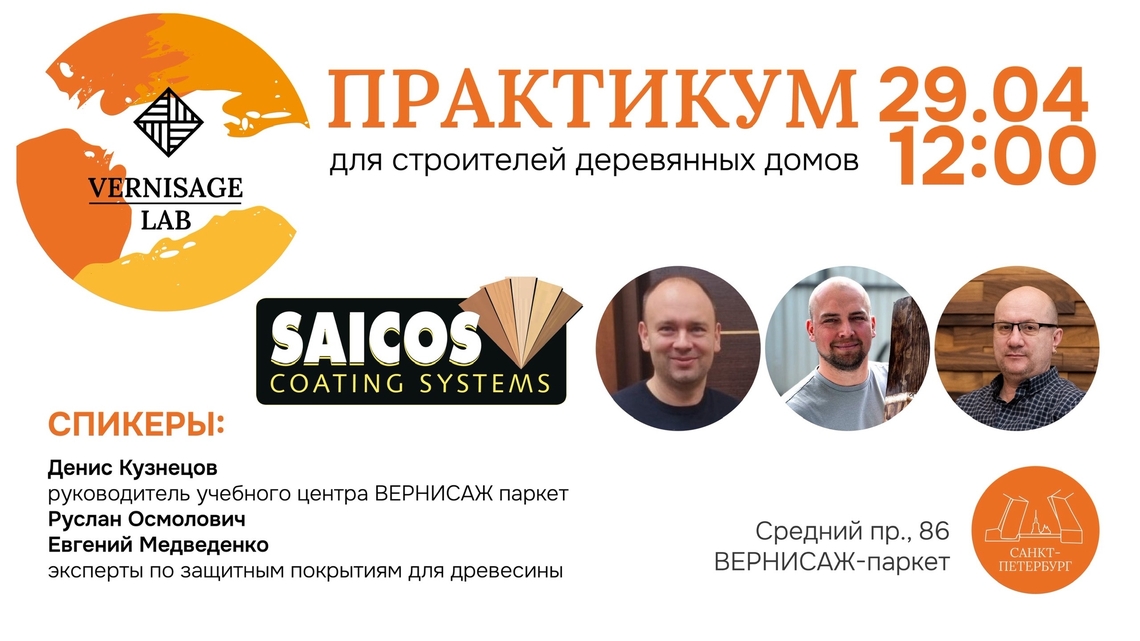 В среду, 29 апреля, наш салон в Санкт-Петербурге станет площадкой для практикума наших коллег их компании Saicos. Эксперты по защитным покрытиям для древесины Руслан Осмолович и Евгений Медведенко, а также руководитель учебного центра компании «Вернисаж» Денис Кузнецов проведут встречу для архитекторов, дизайнеров и строителей деревянных домов.
