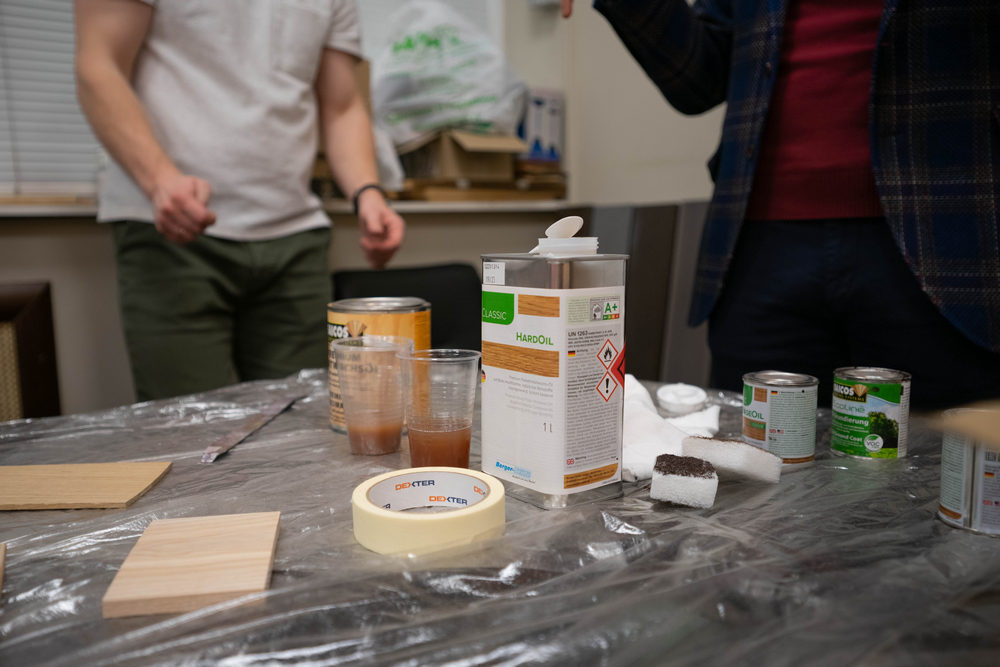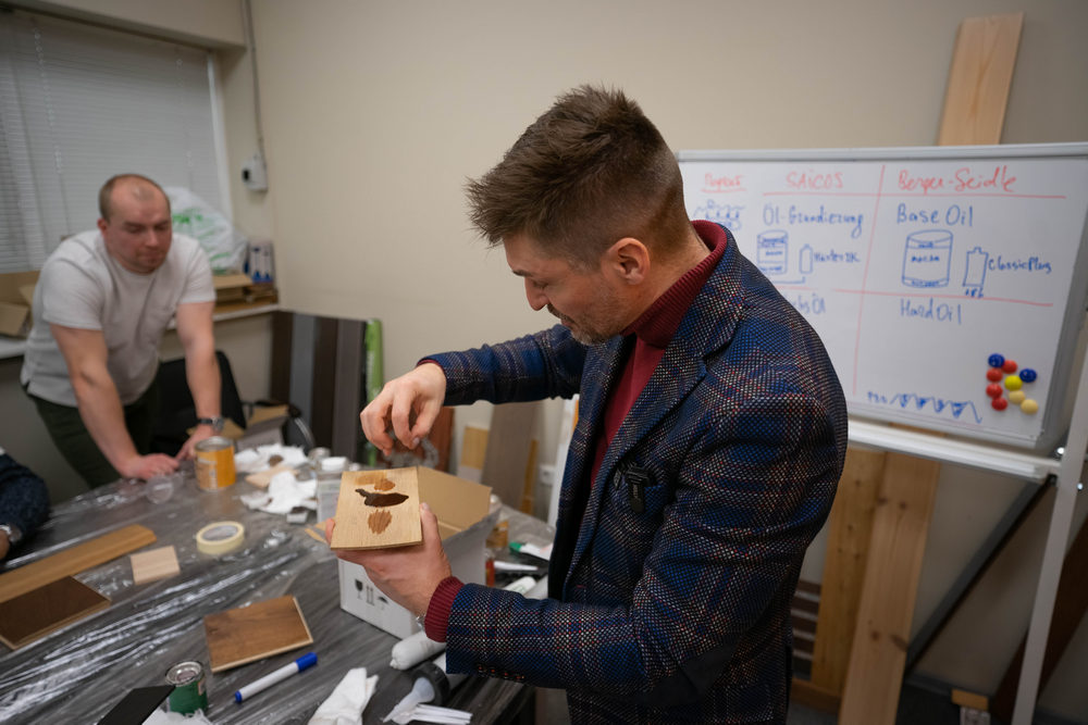 Обучение проходило в офисе наших партнеров компании Saicos на ул. Студенческая, 10. Леонид сделал общий обзор покрытий для паркета и особенно уделил внимание разнице между линейками защитных покрытий на основе масла от брендов Saicos и Berger Seidle. Именно эту паркетную химию немецкого производства мы сами используем при выполнении паркетных работ на объектах наших клиентов и ответственно рекомендуем нашим партнерам-паркетчикам.