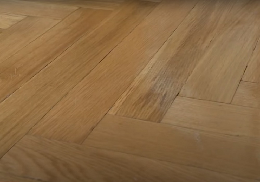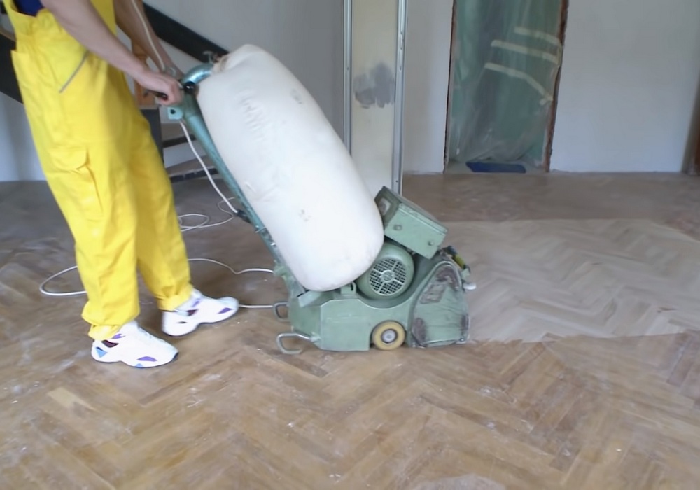 - Сначала с помощью шлифовальной машины мастера выполнили циклевку паркета, чтобы очистить его от старого лака и загрязнений.