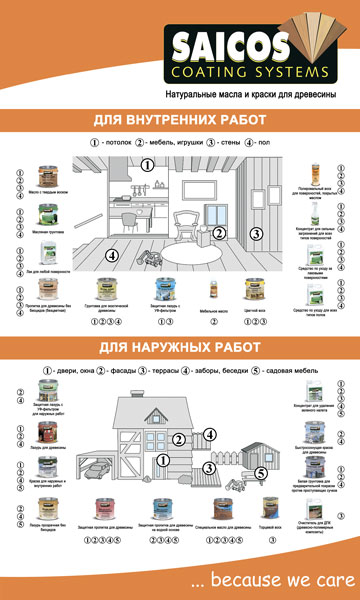Компания Saicos - мировой лидер по производству защитных покрытий для дерева на основе масел и восков. Она производит большую номенклатуру товаров, которые подразделяются не только по области применения внутри или снаружи помещения, но и по видам поверхностей: для пола, для стен, для потолков и пр.