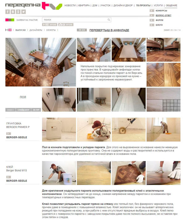 В съемках последующих передач мы использовали двухкомпонентный полиуретановый клей для настила массивного штучного паркета, а также тот же эластичный паркетный клей для укладки паркетной доски.