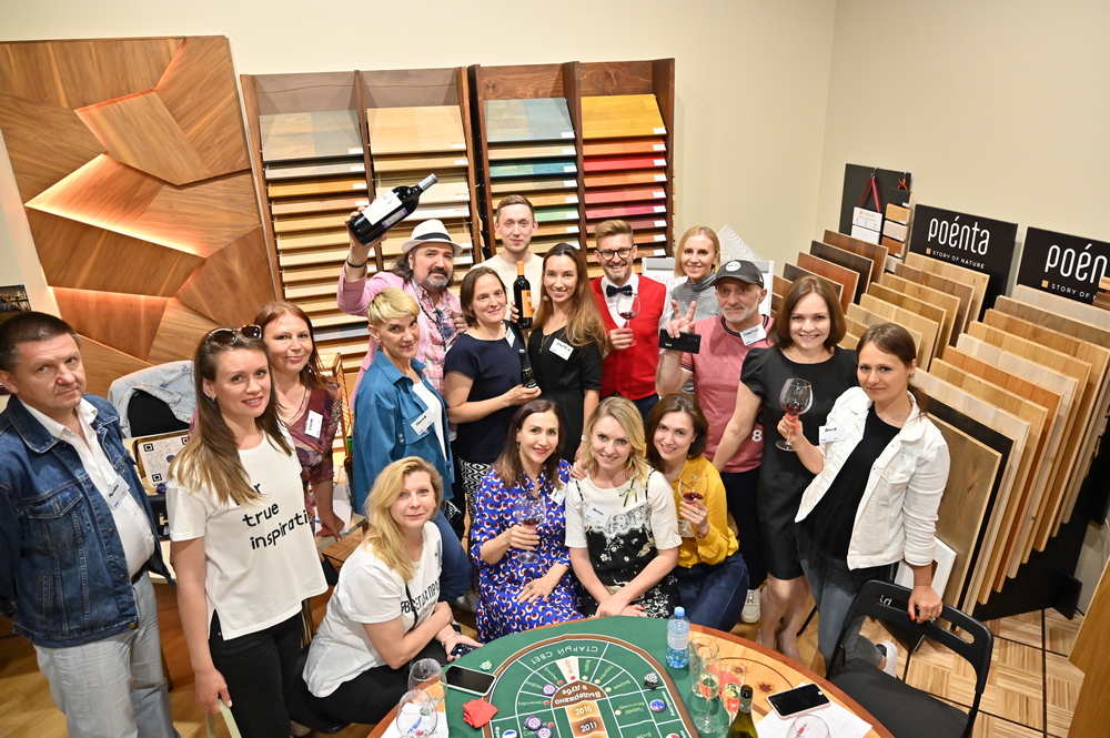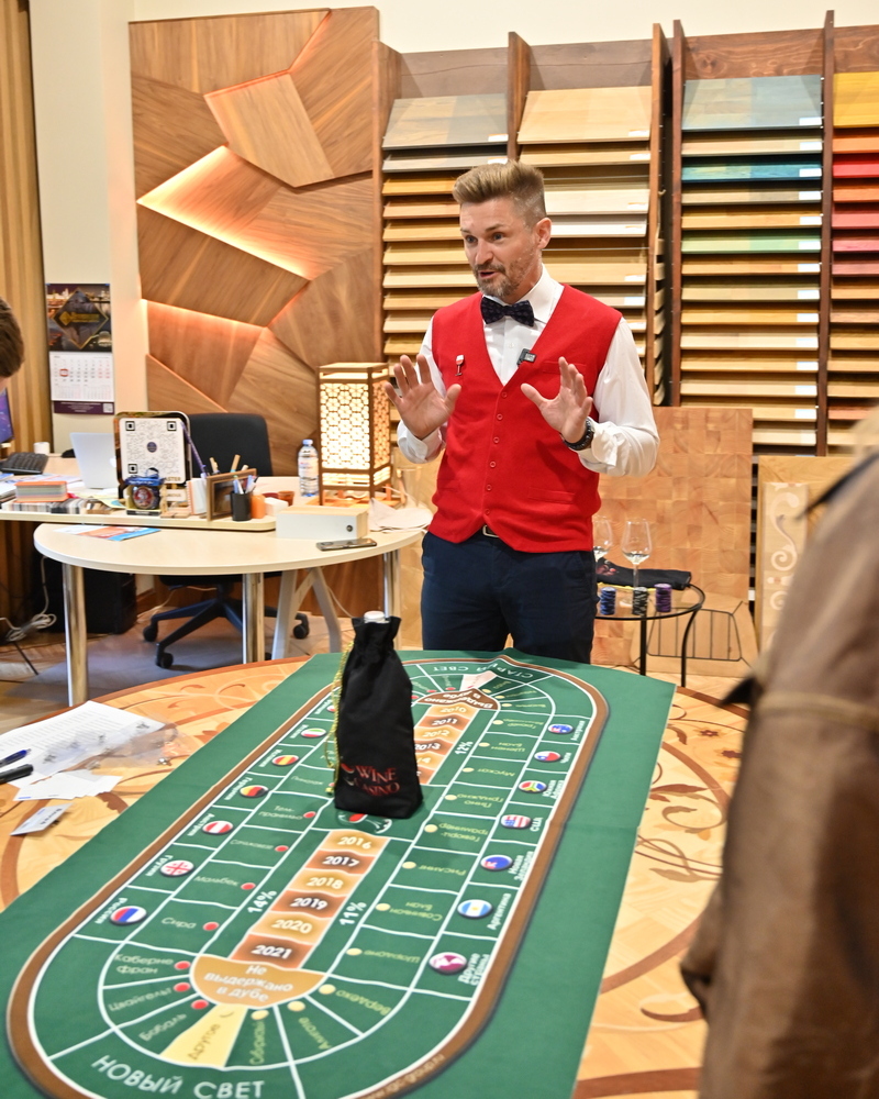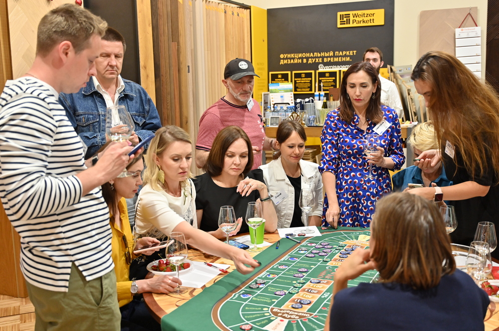 В прошлую среду, 15 июня, в течение четырех часов в нашем московском салоне на Бутырском Валу эксперт по паркету Леонид Хлебников, который одновременно является непьющим сомелье (уже в течение пяти лет совершенно не употребляет алкоголь, но при этом имеет базовые знания о винах), проводил мероприятие «винное казино», где рассказывал о винах, проводил аналогии между паркетом и вином. Все это было сделано в игровой форме – весело и задорно.